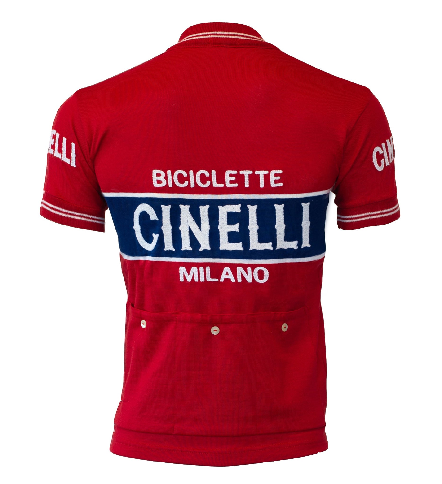 This unique jersey is made of a special merino wool blend, just like the typical racing kits from the 1970s with the vintage Cinelli logo wool embroidery on the front. Features triple elastic rear pockets and buttons for closure. The collar is ribbed with three quarter zip. This item is 100% Made in Italy according to traditional Italian manufacturing techniques produced by the same machines as the jerseys of the period. Perfect kit for any of the historic cycling events across the globe. Color: Red Blue band, White embroidery.